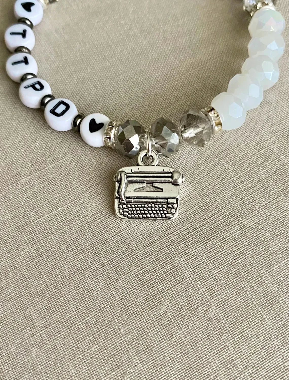 This collectible Taylor Swift inspired TTPD friendship bracelet is made from symbolic white and grey crystal glass beads and features an antique silver typewriter charm, representing The Tortured Poets Department era. It’s the perfect accessory for any Swiftie living in their TTPD era.
